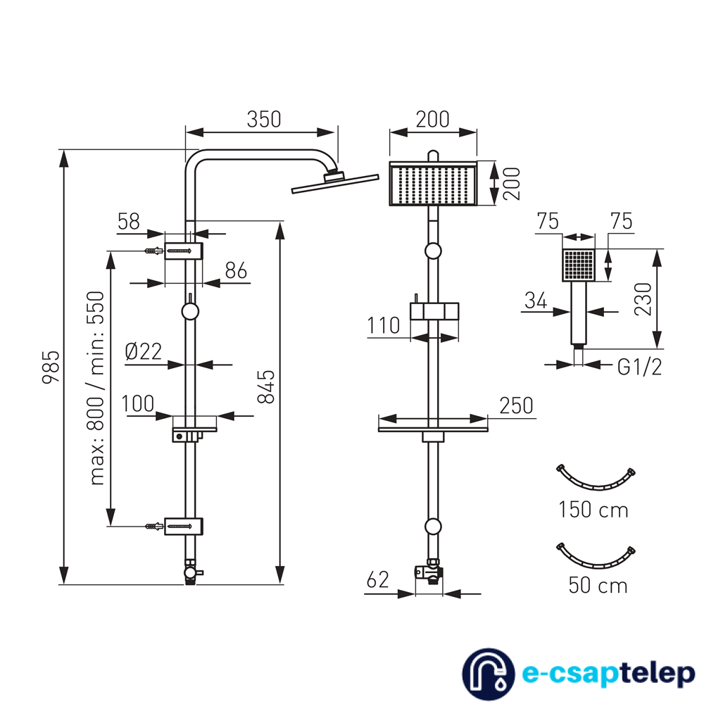 - csatlakozócső (G1/2) univerzális bármely kád- és zuhanycsaptelephez